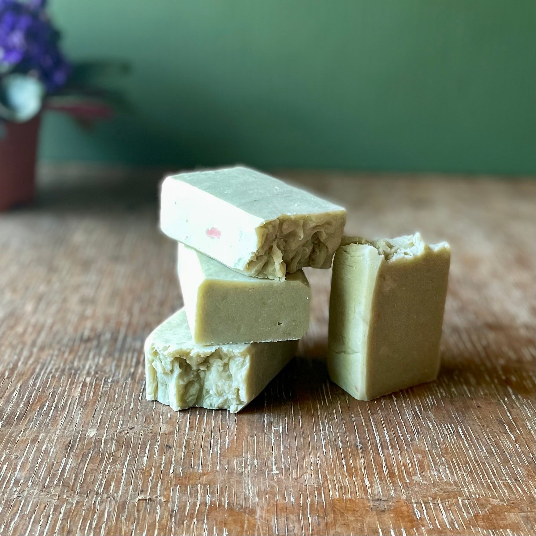 Each of our small batch handcrafted soaps contains organic coconut oil, lard, beef tallow, soybean oil, sodium hydroxide, sodium lactate, goat milk, citric acid, sea salt, extra virgin olive oil, Shea butter, stearic acid, fragrance oil, vegetable glycerin, green clay and vitamin E.